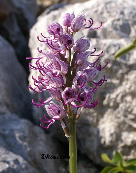 der nächste Verwandte unseres Diskussionsobjektes:Orchis simia, das Affenknabenkraut. Hat zur Unerscheidung keine gewellten Blattränder, keine Punktierung, aber ebenso verkehrte Blühfolge......wird fortgesetzt.....
