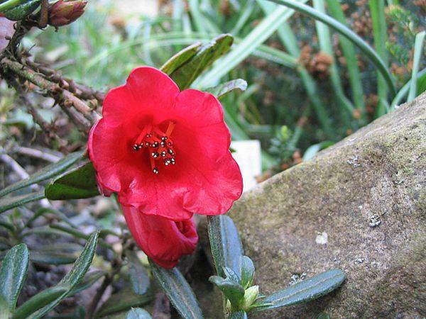 Beide bleiben in unseren Klimaten nur ein Wunschtraum. Sollte allerdings die Klimaerwärmung tatsächlich dauerhaft eintreten, dann haben auch wir die Chance bei diesen wundervollen Wildarten.Ich kann momentan nur mit einem kriechenden Zwerg aufwarten, Rhododendron forrestii repens . Eine Wildart, die nach dem berühmten Pflanzenjäger George Forrest (1873-1932) benannt wurde. Ihr natürliches Vorkommen: Süd-Osten von Tibet, Süd-China und Burma.Ein sehr widerborstiger Rhododendron, der sich viele Jahre weigert, zu blühen. Manche warten sogar vergebens. Aber er hat bei der Züchtung von Rhododendren eine große Rolle gespielt. Die weltberühmten deutschen Züchtungen (Hobbie, Westerstede) mit Namen wie "Elisabeth Hobbie", "Baden-Baden" und "Scarlet Wonder", um nur einige zu nennen, haben Rh. forrestii als charakter- und farbbestimmendes Elternteil.
