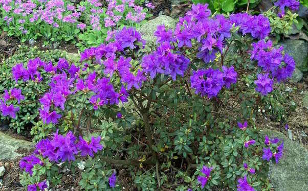 In einem kräftigen "Witwenlila", wie mein Pflanzenfreund H. zu sagen pflegt, der überaus ansehnliche Rhododendron riparoides "Rocks Form". Auch die schöne silber-grüne Belaubung macht ihn zu einem attraktiven Strauch, selbst wenn er nicht blüht.