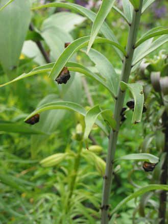 Wartet man mit dem absammeln der Käfer ab, können die knallroten Larven großen Schaden anrichten und die Lilie stark schädigen, indem sie nach und nach alle Blätter abfressen.Fuliro