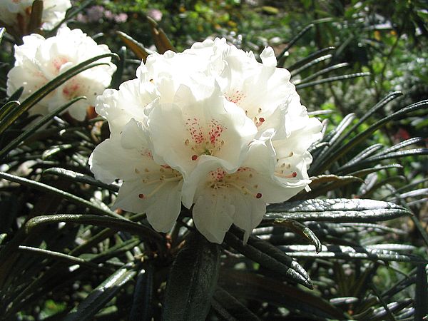 Noch ein "Strunz-Rhodie": Rh. roxieanum var. oreonastes.Von ihm gibt es viele Klone, doch habe ich bislang keinen gesehen mit so schmalen und "gelackten" Blättern wie diesen. Die Blütenstutze sind sehr kompakt und nur so groß wie ein Tennisball.