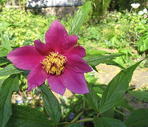 diese beiden paeonien bekam ich heuer von chen yi als paeonia mairei var. (rosa + rote varietät aus gui zhou; die eine blüte wird sich nicht weiterentwickeln, blieb im austrieb stecken, was aber durchaus normal ist bei so importpflanzen). ich zweifle, dass es sich um mairei handelt. im garten treibt zwar eine mairei, aber die ist noch sehr winzig + nicht richtig geeignet zum vergleich. was meinen die "mairei-pfleger" ...mairei oder nicht?