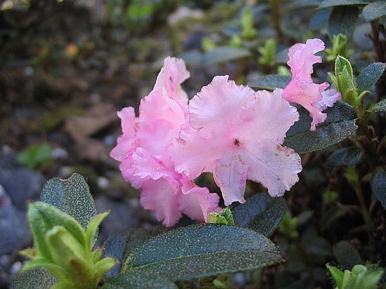 Bescheidener und deutlich kleiner: Rhododendron racemosum . Vorkommen: Süd-China