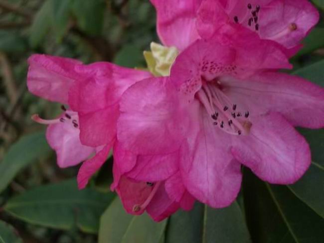 Noch ein "Strunz-Rhodie": Rh. roxieanum var. oreonastes.Von ihm gibt es viele Klone, doch habe ich bislang keinen gesehen mit so schmalen und "gelackten" Blättern wie diesen. Die Blütenstutze sind sehr kompakt und nur so groß wie ein Tennisball.