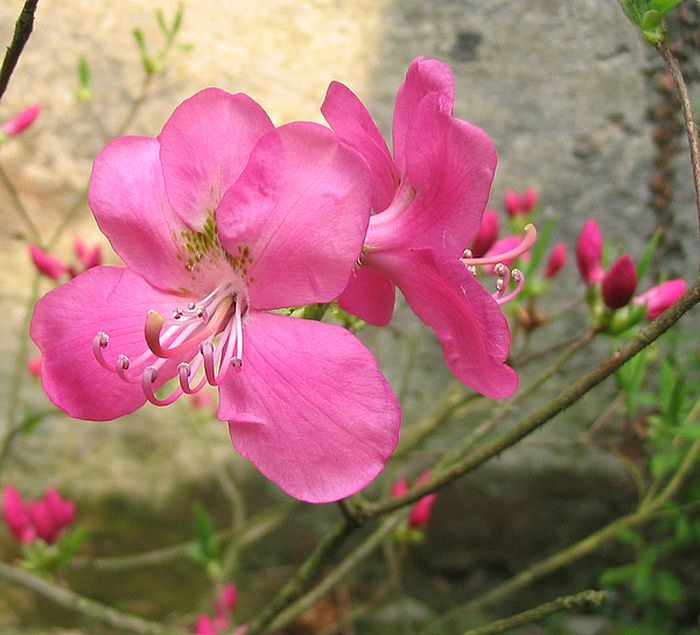 Eine der schönsten Azaleen mit leuchtend ros-roten Blüten: Rhododendron albrechtii. Herkunft: Nord-Japan