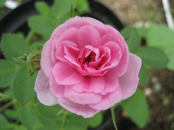 Eine unbekannte, wurzelechte Mini-Centifolie, die ich letzten Herbst vermehrt habe, blüht nun als Topfpflanze im Gewächshaus. Die Mutterpflanze steht bei mir im Garten und wurde in ca. 10 Jahren nicht höher als 40 cm. Die Blüten haben ca. 4 cm Durchmesser, auch die Fiederblätter sind kleiner als bei den Normal-Centifolien.