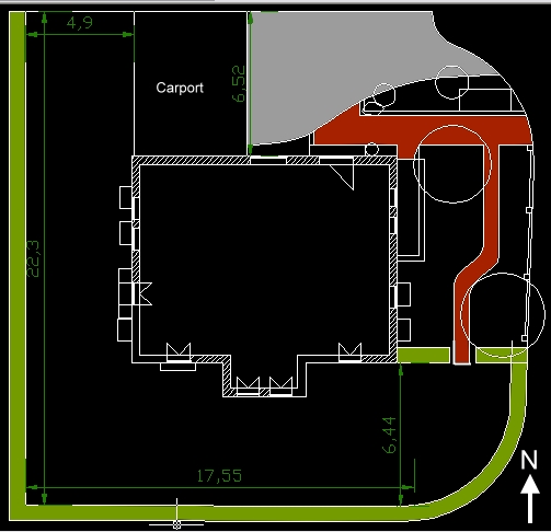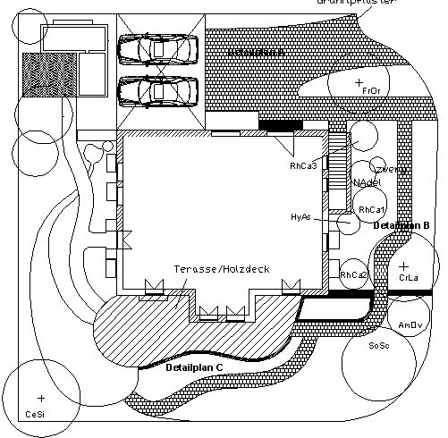 Grau ist vermutlich die Auffahrt, aber was sind die gruenen und die roten "Wuerste" auf dem Plan? Gibts da irgendwo ne Bemassung?Sollen da auch Kinder einziehen und gibts spezielle Wuensche(Spielgeraete...) oder Befuerchtungen(giftig?) dazu?Zu klein fuer Wasser- sehe ich nicht, ich hab schon Gaerten gesehen, die vorwiegend aus einem Teich bestanden: also wenn Wasser, dann dominant. Vermutlich ist hier eine gewisse Grosszuegigkeit angesagt, sonst naehrt man sich einem Zwergengarten...