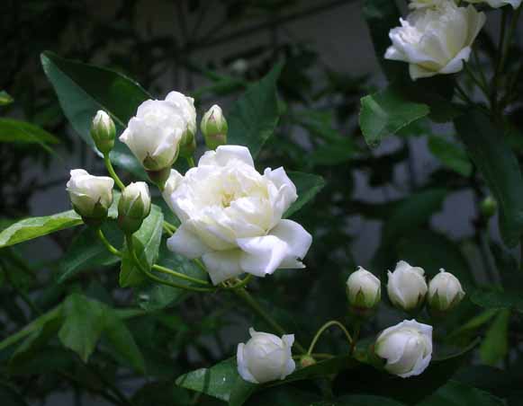Fast-GanzkörperfotoSie steht in der Ecke und breitet sich nach rechts und links über Mauer und Zaun aus.Rosengrüße von kat
