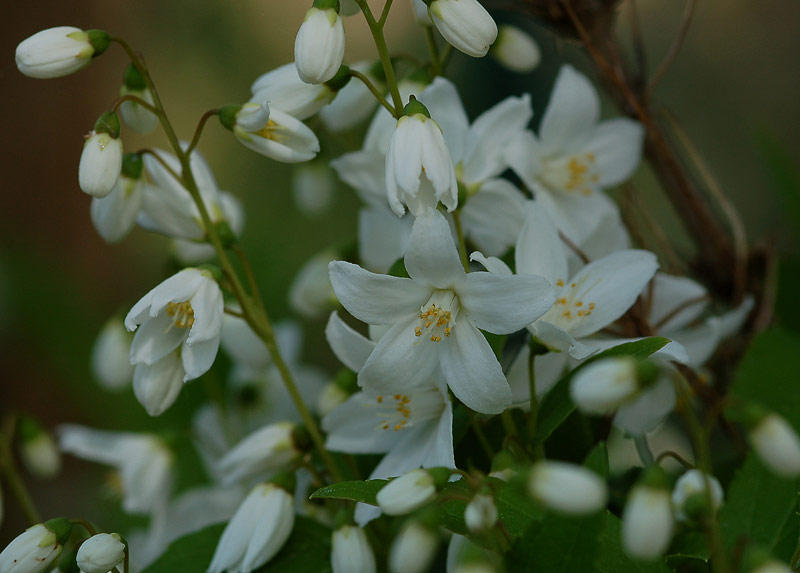 Von der Größe (70 cm)eher eine Staude undblüht seit heute bei mir unter dem Holunder: Deutzia gracilis