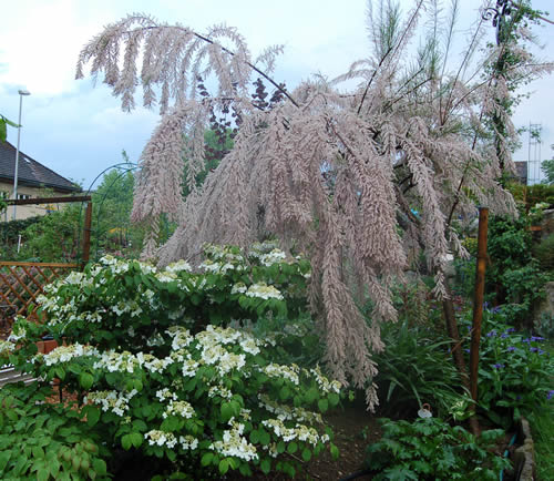Der Etagenschneeball zeigt sich dieses Jahr auch von seiner besonders schönen Seite. (Da die Tamariske gleich darüber schwebt, stelle ich beide zusammen ein).