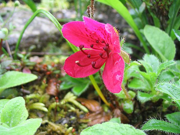 Die Wärme der vergangenen Wochen hat auch dem Nordlandbewohner, Rh. camtchaticum, nicht so recht behagt. Dies hier ist eine fast reinrote Auslese der sonst rot-violett blühenden Art.