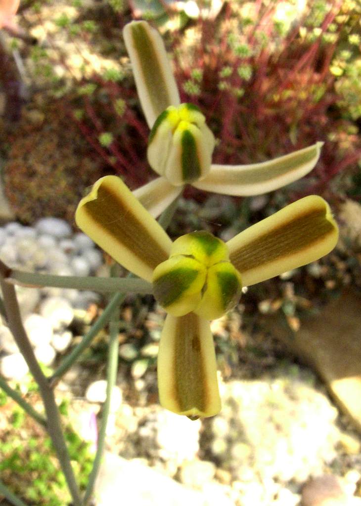 Ein etwas absurd ausschauendes Zwiebelgewächs ist diese Albuca (aus der Verwandtschaft des Milchsterns Ornithogalum). Aus ihrem küchenzwiebelgroßen Speicherorgan wächst zunächst ein kleines Büschel lächerlicher Blätter, die bei 10 cm Länge nur wenige Millimeter im Durchmesser messen und schlaff herumliegen. Dann erhebt sich ein bis zu 50 cm hoher Blütenstand, der an der Basis rund 1 cm dick ist. Es scheint, als ob diese Spezies die notwendige Photosynthese im wesentlichen über das Chlorophyll des Blütenstandes abwickelt.