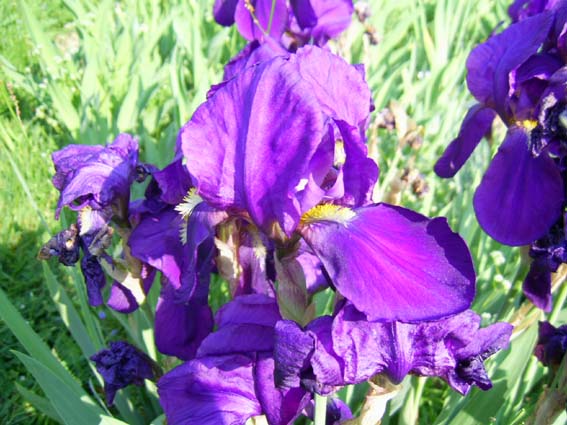 Es gibt violett zweitonige Formen. ’Kharput’ soll so eine sein. Karl Foerster hatte sie in seinem Katalog von 1928: früh 70 cm dunkelblau.Eine einfarbig dunkelviolette Form ist ’Atropurpurea’. Der Name I. albertii ist falsch.Die remontierende satt violette Form, die in alten Katalogen – Karl Foerster früh 60 cm dunkel violett nachhaltigster Massenblüher - mit ’Purple King’ oder ’Pullach’ – früh dunkelblau 60 cm - bezeichnet wurde, weist wenig oder keine Schlundaderung auf.Die Gräfin von Zeppelin bietet eine Iris spectabilis an, die mit den einfarbig dunkelvioletten identisch und deren Name lediglich ein Synonym für Iris germanica ist.Es gibt also, kurz gesagt, zwei blauviolette Farbvarianten. Die eine ist zweitonig mit hellerem Dom, eine Bitone, und die andere ist dunkelviolett und eine Self. Diese beiden trifft man mit großer Wahrscheinlichkeit in Deutschland, Frankreich oder Italien an. Die Bitone hat Dürer 1503 gemaltdie Abbildung habe ich am 10. April 2008 entfernt