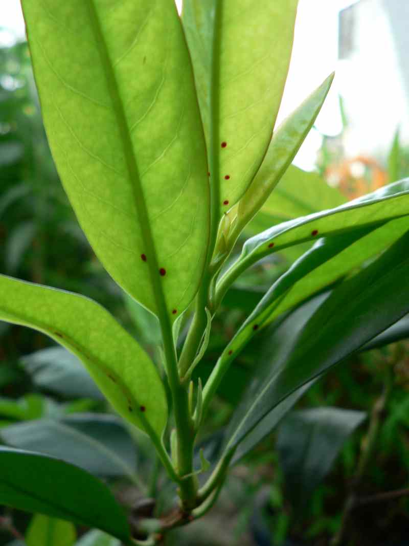 Zu Hülf! Zu Hülf! Ich habe lauter Probleme mit meinem Kirschlorbeer!1) Problem am (ersten) P.l. 'Herbergii':Am Neuaustrieb habe ich heute lauter rotbraune Pünktchen entdeckt, ca. 1-2mm groß und wie draufgeklebt. Also es sieht für mich schon so aus, dass da was drauf ist, nicht im Blatt drin. HIer das erste Foto dazu: