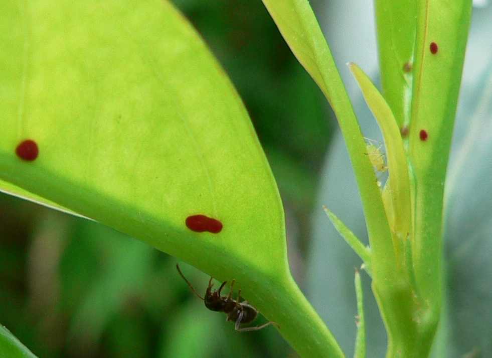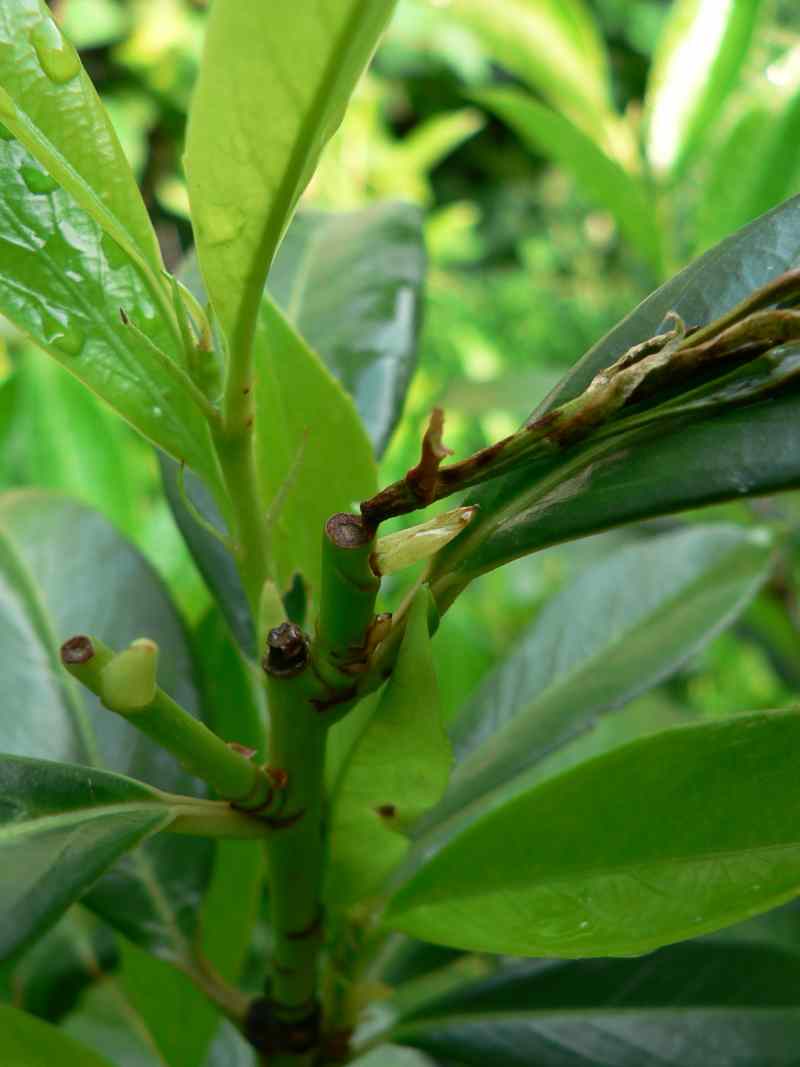 Zu Hülf! Zu Hülf! Ich habe lauter Probleme mit meinem Kirschlorbeer!1) Problem am (ersten) P.l. 'Herbergii':Am Neuaustrieb habe ich heute lauter rotbraune Pünktchen entdeckt, ca. 1-2mm groß und wie draufgeklebt. Also es sieht für mich schon so aus, dass da was drauf ist, nicht im Blatt drin. HIer das erste Foto dazu: