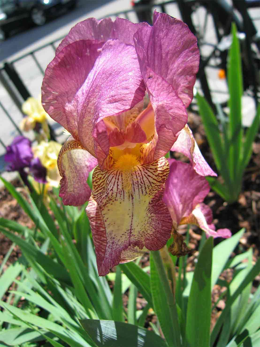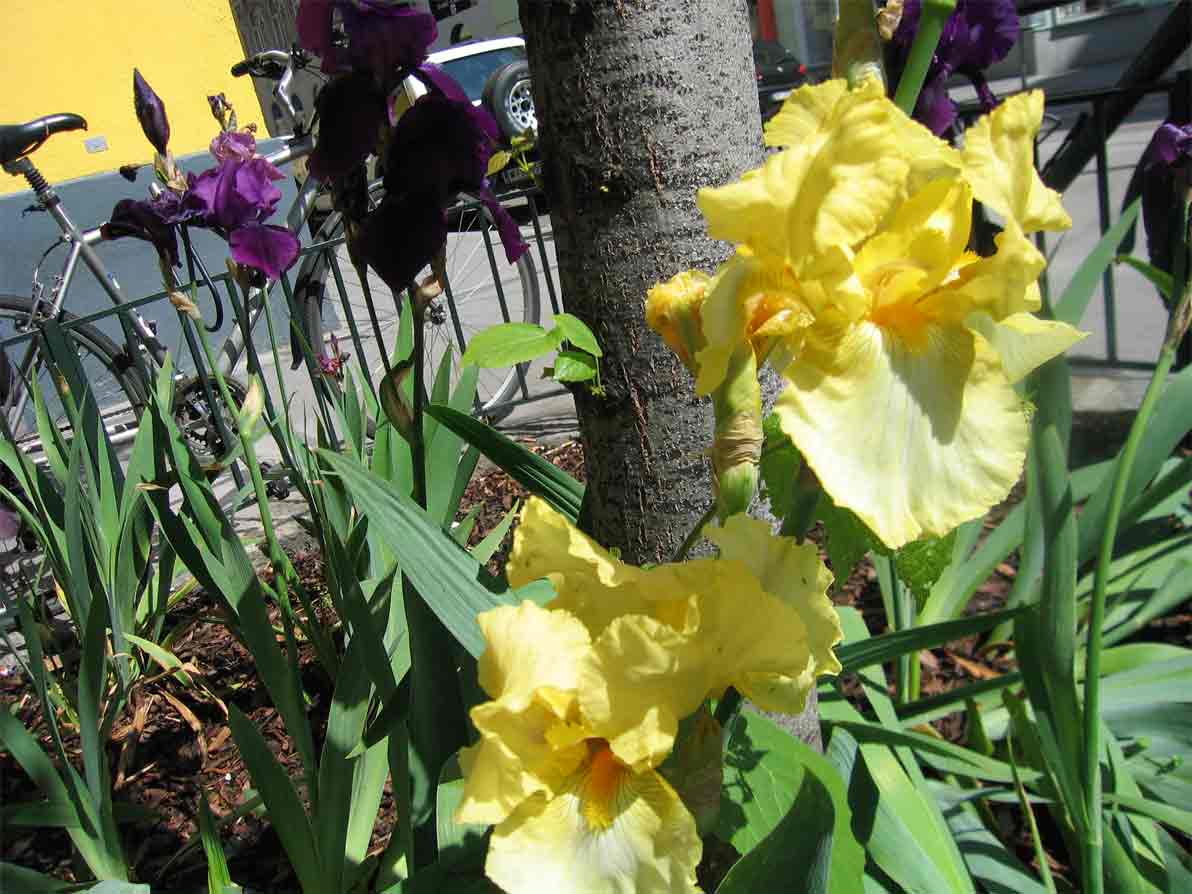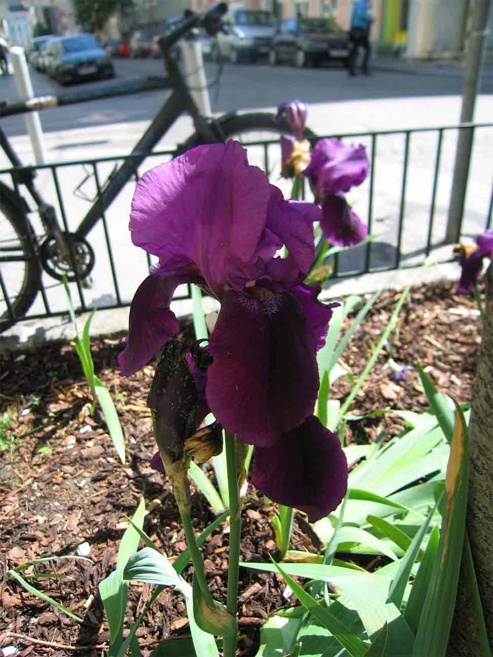 Ungewöhnlich erscheint mir auf jeden Fall, daß sie, um Bäume gepflanzt, das Großstadtbild mit ihren Farben verschönern. Den Rindenmulch scheinen sie zu vertragen, viel Schatten und Abgase offensichtlich auch. Windig war's, und über das Gitter klettern mochte ich auch nicht, daher sind es wieder einmal keine besoderen Aufnahmen. Die eine oder andere könnte hier schon vorgekommen sein, aber als absoluter Irislaie bin ich mir da nicht sicher. Sie sind alle so um die 70-80cm hoch.