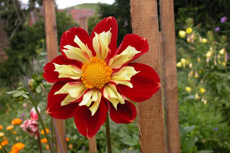Hallo Maria,ich würde die Dahlie einfach etwas tiefer setzen, sie hat so mehr Halt und wird kräftiger. Viel Freude an den DahlienDahlia