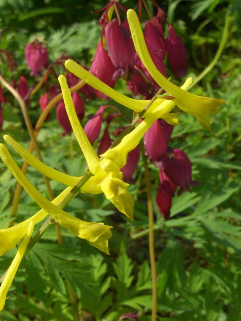 In Gelb blühend und damit in einem guten Kontrast zur Dicentra formosa Cox's Dark Red stehend erfreut Corydalis davidii aus China. Die Art ist ein etwas spürrelig wachsender Langblüher.