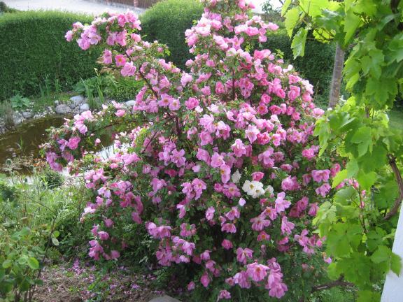 Einer der vielen Ausläufer meiner unbekannten Alba (ich glaube, es ist eine Maxima) liefert die erste Blüte, während der Hauptstrauch nur Knospen zeigt. Der Hauch von Rosa zeigt sich nur am ersten Blütentag.
