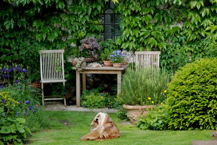 Ich stelle fest, dass so ein Hund doch sehr dekorativ ist ;DDer 'Bevis' ist ja ein Prachtexemplar!Und hinter dem dekorierten Tischchen ist ja wieder so ein raffiniertes Spiegelfenster :DDie Clematis spricht ja Bände, was die Häufigkeit der Nutzung angeht