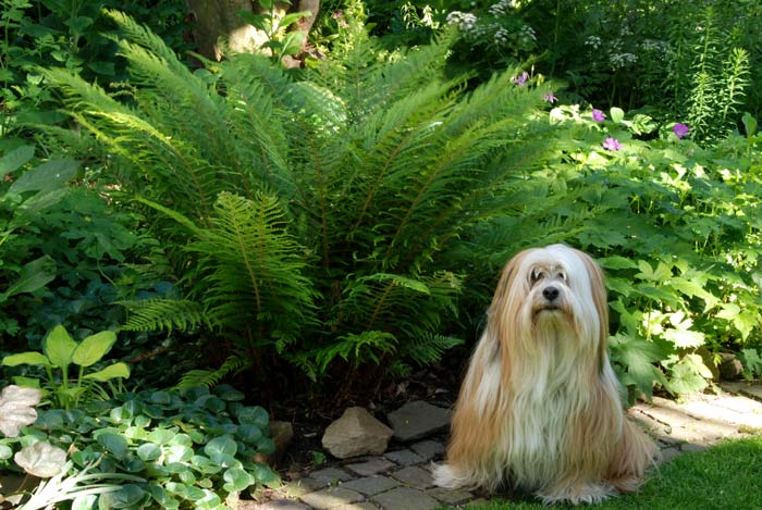 und hier bewacht der gefährliche Wachhund den Farn Polystichum setiferum pulcherrimum ´Bevis´ und macht außerdem die Größenverhältnisse deutlich