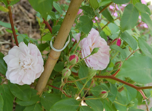 Ebenfalls voll Knospen ist Blush Noisette, die mit zwei Blüten die Saison einläutet!