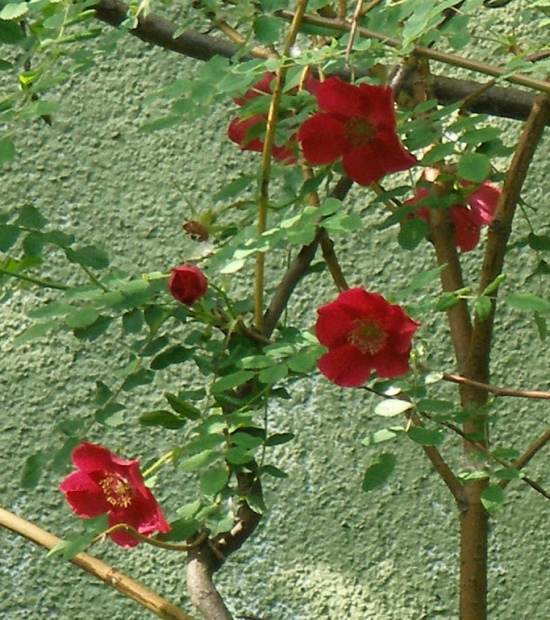 ein paar blüten wird meiner haben heuer, gesetzt habe ich ihn vorigen herbst. freu mich noch mehr, wenn ich Dein bild sehe, Birigt.jedes jahr etliche blüten mehr hat rosa moyesii, das rot ist strahlend uohne grell zu sein.