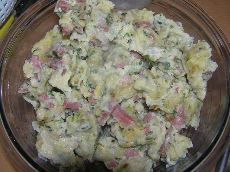 (wurstknöpfchen)dazu wird ein spätzlesteig aus eiern, mehl, salz und wenn nötig etwas wasser hergestellt.dann brauch man ein stück gerauchte schinkenwurst (man nennt es auch jagdwurst oder bergsteigersalami, sieht ähnlich aus wie salami, ist aber heller, feiner und schmeckt ganz anders)diese wird in schmale kurze streifen geschnitten und dem spätzlesteig zugegeben.dann wird in einer pfanne zwiebelwürfel angebraten, zum schluß kommt noch eine menge kleingehackte petersilie dazu.dies auch zum spätzlesteig und gut vermengen.salzwasser zum sieden bringen.nun mit einem teelöffel (der immer wieder ins heiße wasser getaucht wird) knöpfle abstechen und ins wasser geben.die wurstknöpfle sind fertig, wenn sie nach oben steigen, dann mit einer schaumkelle rausnehmen.diese werden auf unterschiedliche arten (ähnlich wie maultaschen) gegessen. entweder als suppeneinlage in fleischbrühe, oder angebraten mit salat dazu oder mit gebratenen zwiebelringen darüber und schwäbischer kartoffelsalat dazu.lassen sich im übrigen auch prima einfrieren.