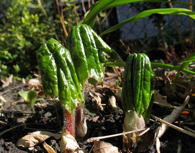 Hier ist ein Bild (heute) von Dysosma versipellis. Das Blatt sieht genauso aus wie das von Podophyllum delavayi von knorbs (S.7 oben). Ich nehme an das mein Name ein Synonym ist ,oder? Würde mich mal interessieren.LGhederatotal