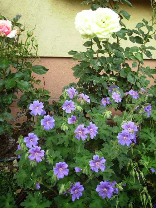 So manches Geranium könnte etwas länger blühen, aber irgendeines blüht abgesehen von Winter und zeitigem Frühjahr immer.Orion darf ruhig wuchern, ich habe genug Platz eingeplant, eigentlich wollte ich es zur Abraham Darby pflanzen, aber beim Hinplatzieren ist mein Arm plötzlich neben der The Pilgrim stehen geblieben, ich finde, die beiden passen gut zusammen.The Pilgrim (für alle die nichts damit anfangen können, das ist eine hellgelbblühende engl. Rose) neigt bei mir auch sehr zum Wuchern, die werden sich gut verstehen.