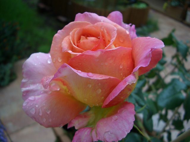 Da war ich doch bereit, meine geschenkte Bonita Renaissance als Kitschrose zu nominieren. Die Blüten eine Mischung aus Textmarker-Pink und Textmarker-Orange. Habe sie dezent hinter das Wasserfass gepflanzt, um keinen Augenkrebs zu kriegen