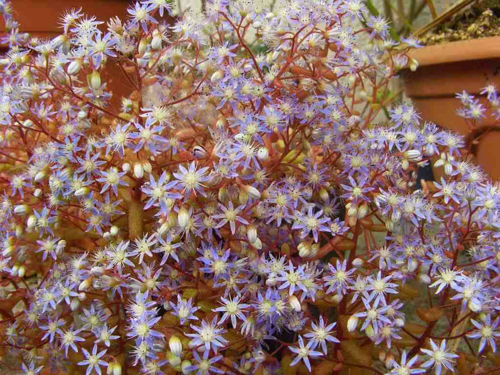 Mal wieder etwas von aus der "& Co"-Kategorie: wie jedes Jahr blüht auch heuer das so ziemlich einzige blaublühende Mitglied der Familie Crassulaceae, Sedum caeruleum, wieder reichlich - muss es auch, denn es ist ja nur einjährig.