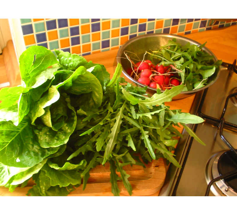Ich ernte jetzt seit Wochen Salat und komme nicht mehr hinterher mit dem Ernten und Essen. Als Salatneuling hatte ich großzügig ins Frühbeet gesät, damit überhaupt etwas aufgeht, nun ja, und dann hate ich plötzlich an die 80 Salatsetzlinge im Garten. Habebschon mein Bestes getan und teilweise viele davon ganz klein geerntet, aber ich habe eine absolute Salatschwemme und jetzt fangen sie teilweise schon zu schießen an.Zum Glück muß ich meine wilde Rauke und Portulak gerade nicht auch noch essen, da sie noch vom Versetzen schlapp sind.Auf meinen Rhabarber und Sauerampfer hab eich gar kkeine Lust mehr.Ansonsten immer noch Spinat, Mangold, Kräuter, Erdbeeren, Kohlrabi, viele Zuckerschoten, letzte Rettiche, ersten Himbeeren.