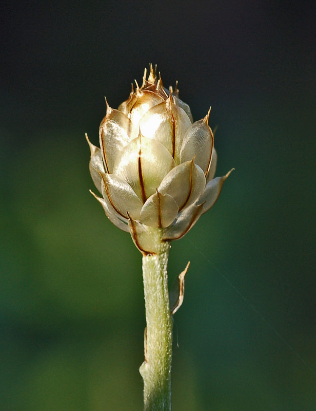 Die Rasselblume Catananche caerulea Major hat auch einen sehr schönen Kelch, der gülden glänzt und aussieht wie Pergamentpapier.