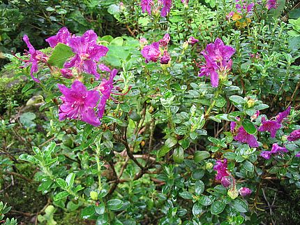 Ein sehr schöner Rhododendron saluenense (vermutlich die Subspecies chamaeunum) blüht regelmäßig überraschend spät. Durch das warme Frühjahr und den derzeit regenreichen Frühsommer etwas früher als üblich.Eine mir sehr kostbare Pflanze, zumal die Blüte eine strahlend violette Tönung hat.Die genaue Bestimmung, welcher Art der Rhodie ist, ist mir bislang nicht gelungen.