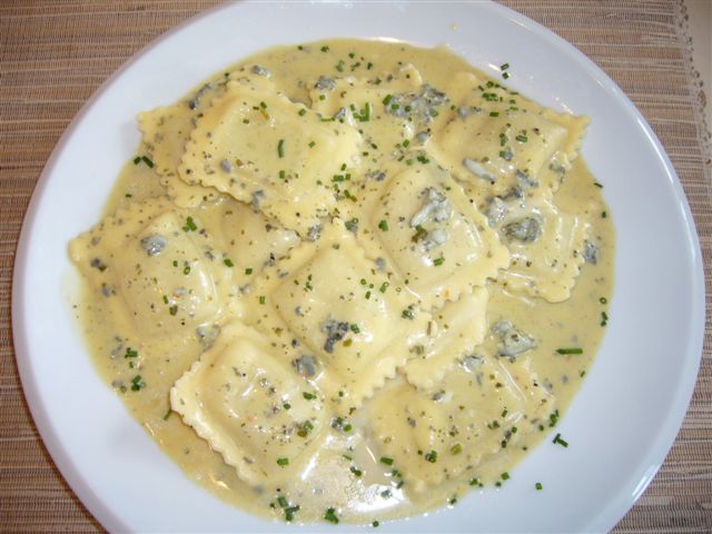 heute gab es:Ruccola-SalatRavioli gefüllt mit Frischkäse und frischen Gartenkräuter an einer Gorgonzola-Weisswein-Saucefrische Erdbeeren ais dem Garten mit etwas flaumig geschlagenem Rahm