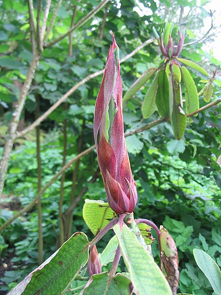 Übertrieben lange Austriebsknospen, geradezu im Flamboyantstil, entwickelt Rhodendron auriculatum . Diese Wildart, eigentlich für unsere Breiten zu "weich" (hat bei mir aber über 15 Jahre gut durchgehalten), ist außer zur Blütezeit immer unbefriedigend. Die Blätter sehen meist schäbig aus und sind trotzt aller Bodentzuschlagstoffe nicht dunkelgrün zu färben. Zu allem Überfluss wirft er die Blätter des Vorjahres ab, wenn der Neuaustrieb beginnt. Besucher meinen deshalb immer, der Strauch stehe kurz vor dem Exitus.Aber wenn er dann blüht, ist alles Negative vergessen. Er ist einer der ganz Späten. Auf die Blüte werde ich noch etwa 1-2 Wochen warten müssen.