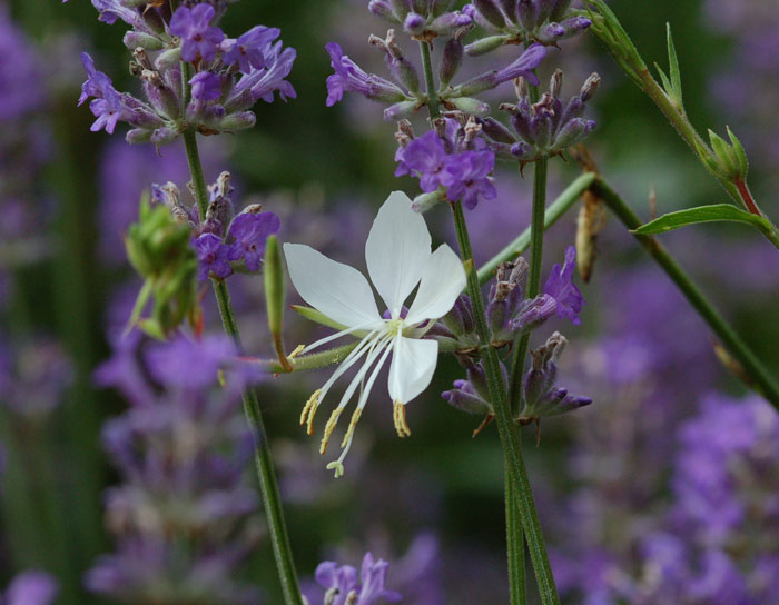 Der Acanthus wäre auch noch was.. Aber langsam geht mir der Platz aus.Bei meinem Gartenrundgang heute Morgen habe ich die Kamera mitgenommen:Gaura lindheimeri Whirling Butterflies mit Lavendel