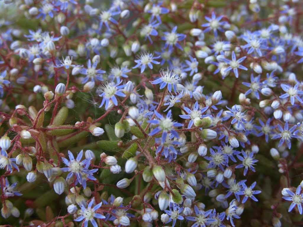 ... und natürlich das mit seinen blauen Blüten über rotem Laub einmalig schöne, aber leider nur einjährige Sedum caeruleum.