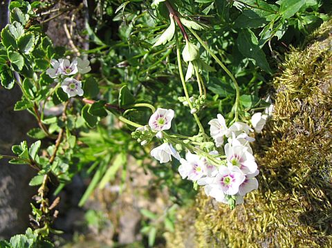 Ein recht hübsches Pflänzchen und über 2 Winter bisher "hart" ist Parahebe lyallii . Wieder einmal ein Blüher, bei dem man scharf hinsehen muss, um seine zarte Schönheit zu entdecken.
