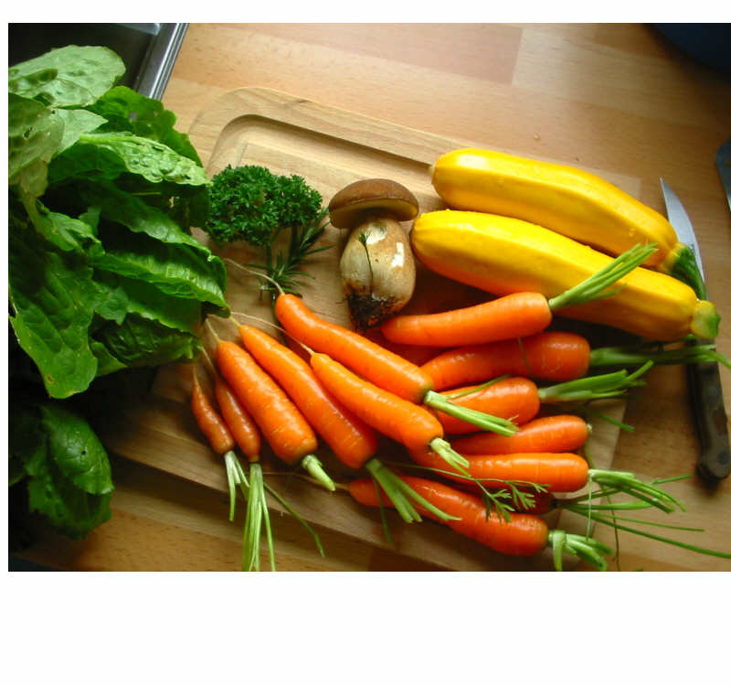 Das hier, wie fast jeden Tag, aber der kleine, nette Kerl in der Mitte ist uns gestern im Wald zugelaufen, etwas vorschnell, der Kleine....hab´ ihn dafür gleich gekascht!Außerdem noch Grünzeugs zum Würzen, die dicken Bohnen sind leider noch nicht reif!