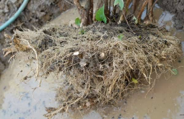). Vorbereitend für den Umzug, der aus verschiedenen Gründen jetzt stattfinden muss, habe ich am Wochenende den Strauch ausgelichtet (ca. ein Drittel der Basistriebe rausgenommen) und gekürzt (auf maximal 1,5 m). Gestern habe ich zu buddeln begonnen - und beim Spatenkontakt mit den unterirdischen Teilen rasch das Fürchten gekriegt: