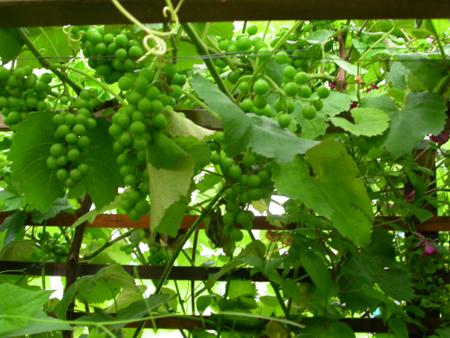 Ich habe heute morgen mal ein Bild von meinem Wein gemacht. Dieser Stock ist im 5. Jahr, wurde noch nie irgendwie gespritzt oder gedüngt und bildet ein dichtes 'Dach' zwischen einer Spalierwand und dem Pavillion. Dabei überbrückt er, durch Drähte gestützt, ca. 2 Meter.