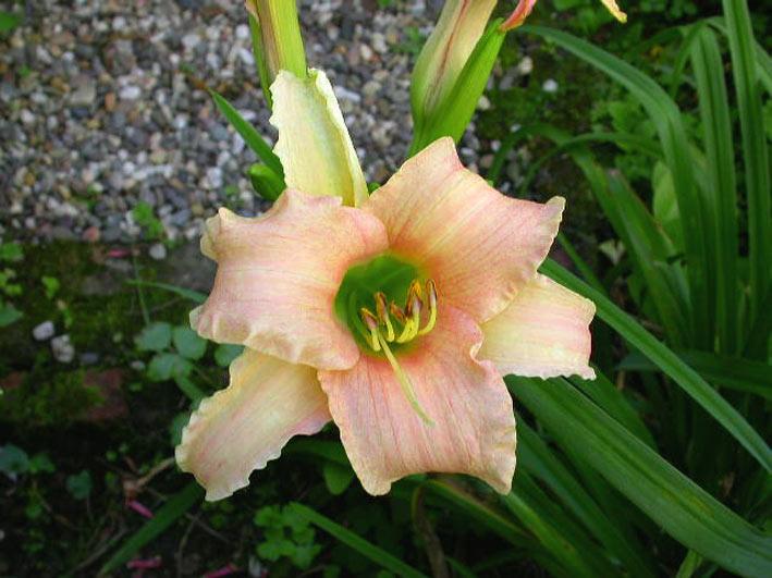 Es ist tatsächlich eine sehr wandelbare Taglilie, sie wechselt je nach Tageszeit und Temperaturen zwischen reinem Lachs und weißlich-rosa. Einzig der grüne Schlund bleibt konstant.