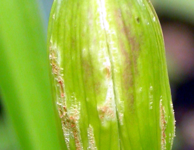 Habe ich gleich nach dem Foto gemacht. Was mich außer der Schneckenfrechheit und dem Mückenbefall noch irritiert, sind die kleinen, kaum erkennbaren Stippen auf der Knospe. Das habe ich leider auch bei anderen Taglilien beobachtet, die nicht von Schnecken heimgesucht wurden. Sieht so aus, als wenn irgendwas von innen gegen die Blätter pieken würde...Davor gibt es zwei kleinere Knospen, soweit ich das auf dem Foto sehen kann, von denen die vordere nach Gallmückenbefall aussieht. Die würde ich wegnehmen.