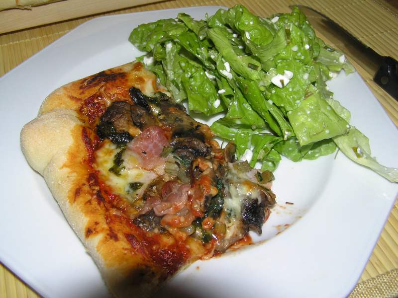 die da waren: tomatensugo mit viel knoblauch, frisch geraspelter käse (edamer und ziegenbutterkäse), frischen (vorher kurz angebratenen) champignons, gekochter sowie geräucherter schinken, wenig mangold (die blätter waren im garten umgeknickt), eine zerrupfte mozzarellakugel sowie etwas von meinem selbstgemachten basilikumpesto (nur öl, basilikum und salz zusammen püriert, nehme ich normalerweise für tomate-mozzarella)