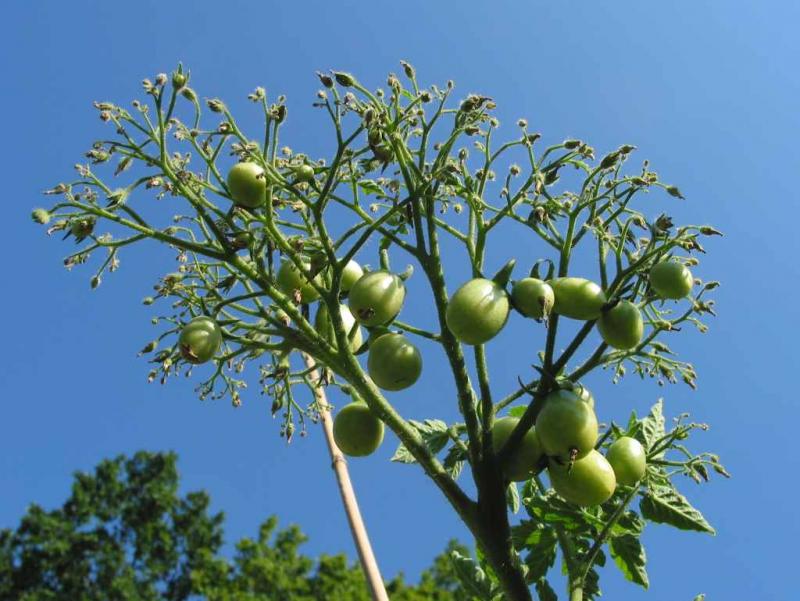 Ich habe letztes Jahr von einer de.rec.garten Teilnehmerin einige kleine gelbe birnenförmige Tomaten erhalten. Eine Pflanze aus den Samen habe ich aufgezogen, und ich bin überrascht von den Blütenrispen. Ich hatte die Blütenanzahl pro Rispe auf weit über hundert geschätzt, heute habe ich nochmal nachgesehen und bin für eine Rispe auf eher deutlich über zweihundert gekommen. Allerdings verdorren die meisten Blüten, es entwickeln sich also keine hundert oder zweihundert Früchte pro Rispe.Die Pflanze wächst ansonsten normal. Das Bild zeigt eine nicht ganz so große Rispe, aber dafür ist sie vor dem gewählten Hintergrund besser zu erkennen.