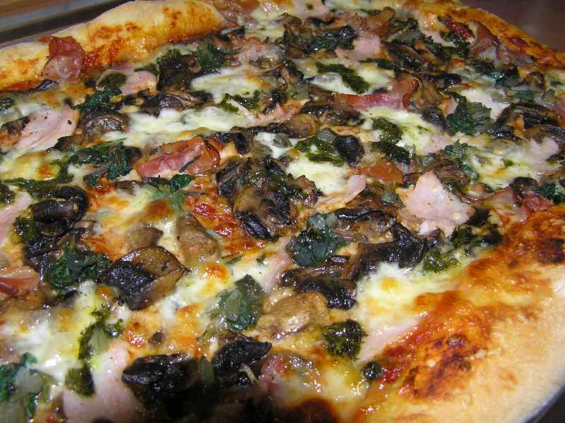 die da waren: tomatensugo mit viel knoblauch, frisch geraspelter käse (edamer und ziegenbutterkäse), frischen (vorher kurz angebratenen) champignons, gekochter sowie geräucherter schinken, wenig mangold (die blätter waren im garten umgeknickt), eine zerrupfte mozzarellakugel sowie etwas von meinem selbstgemachten basilikumpesto (nur öl, basilikum und salz zusammen püriert, nehme ich normalerweise für tomate-mozzarella)