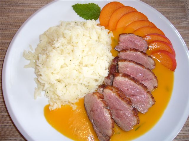 es gab:Ruccolasalat mit französischem SchafskäseEntenbrust auf Aprikosensauce mit ReisLavendel-Creme...... ich weiss, dass nicht Sonntag ist, aber daran ist mein neuer Nacbar schuld