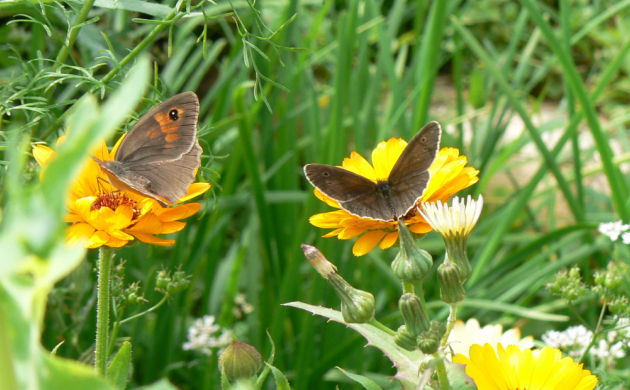 Mohrenfalter unter sich: Großes Ochsenauge (Maniola jurtina) und Schornsteinfeger (Aphanopus hyperantus)